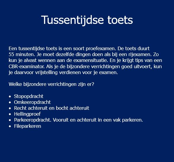 Een tussentijdse toets is een soort proefexamen. De toets duurt 55 minuten. Je moet dezelfde dingen doen als bij een rijexamen. Zo kun je alvast wennen aan de examensituatie. En je krijgt tips van een CBR-examinator. Als je de bijzondere verrichtingen goed uitvoert, kun je daarvoor vrijstelling verdienen voor je examen.